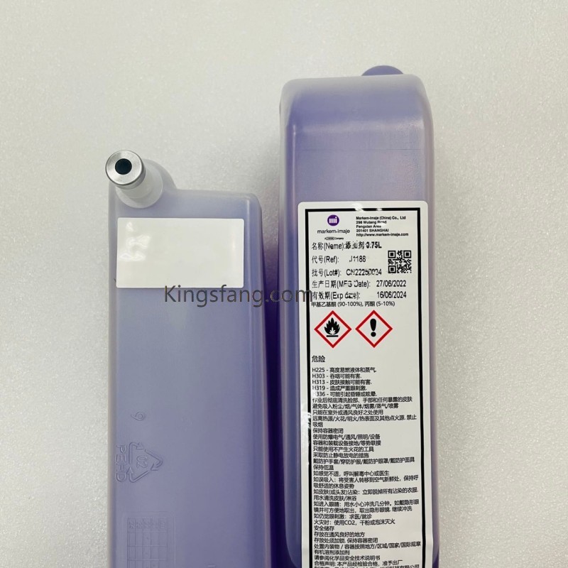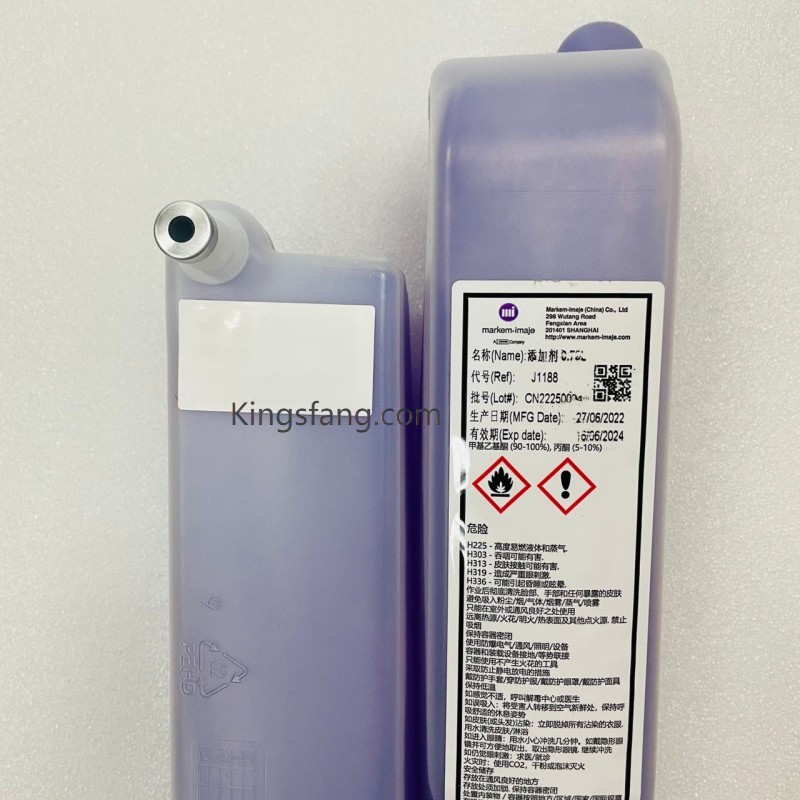 سائل التعبئة J1188 (المعروف أيضًا باسم المادة المضافة J1188) هو سائل مذيب يُستخدم في طابعات ماركيم-إيماج الصناعية النافثة للحبر المستمر (CIJ)، وليس حبرًا بحد ذاته. يُضاف هذا المذيب، القائم على مادة ميثيل إيثيل كيتون (MEK)، تلقائيًا بواسطة الطابعة للحفاظ على اللزوجة والأداء الصحيحين للحبر الأسود الرئيسي (الذي يُستخدم غالبًا مع حبر MB1175) أثناء التشغيل.